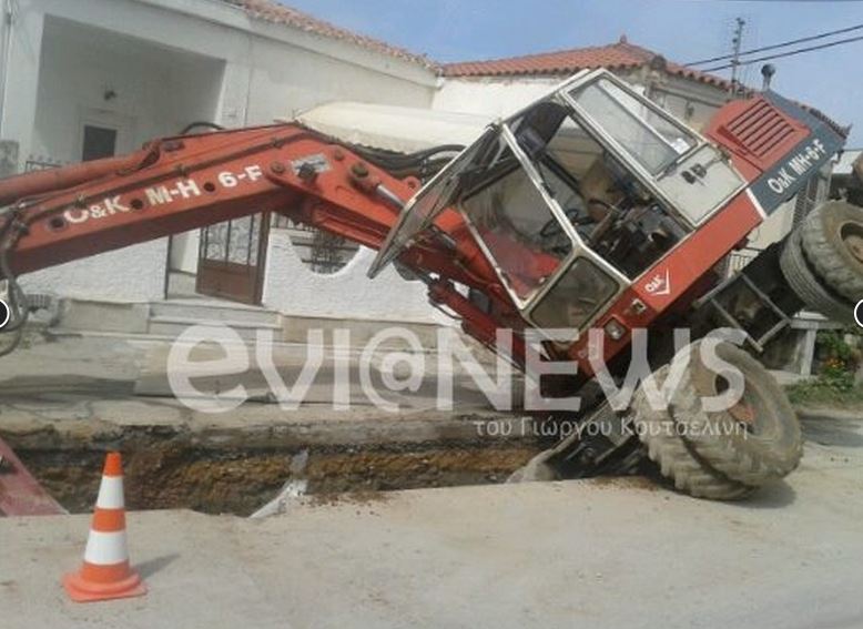 Ένας μεγάλος εκσκαφέας στην περιοχή του Αλιβερίου, έπεσε μέσα σε ένα βαθύ χαντάκι που είχε ανοίξει στο δρόμο, για έργα στην περιοχή.