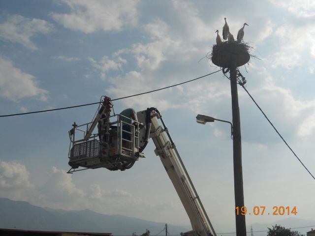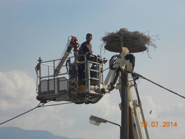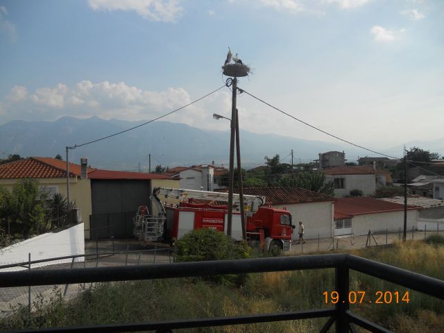 Στο σημείο έσπευσαν άνδρες της 7ης ΕΜΑΚ με καλαθοφόρο όχημα της Πυροσβεστικής, οι οποίοι με βοήθεια και της ΔΕΗ κατάφεραν να απεγκλωβίσουν τους πελαργούς, τα πόδια των οποίων είχαν μπλεχτεί σε μικρά καλώδια που προεξείχαν κάτω από τη φωλιά.