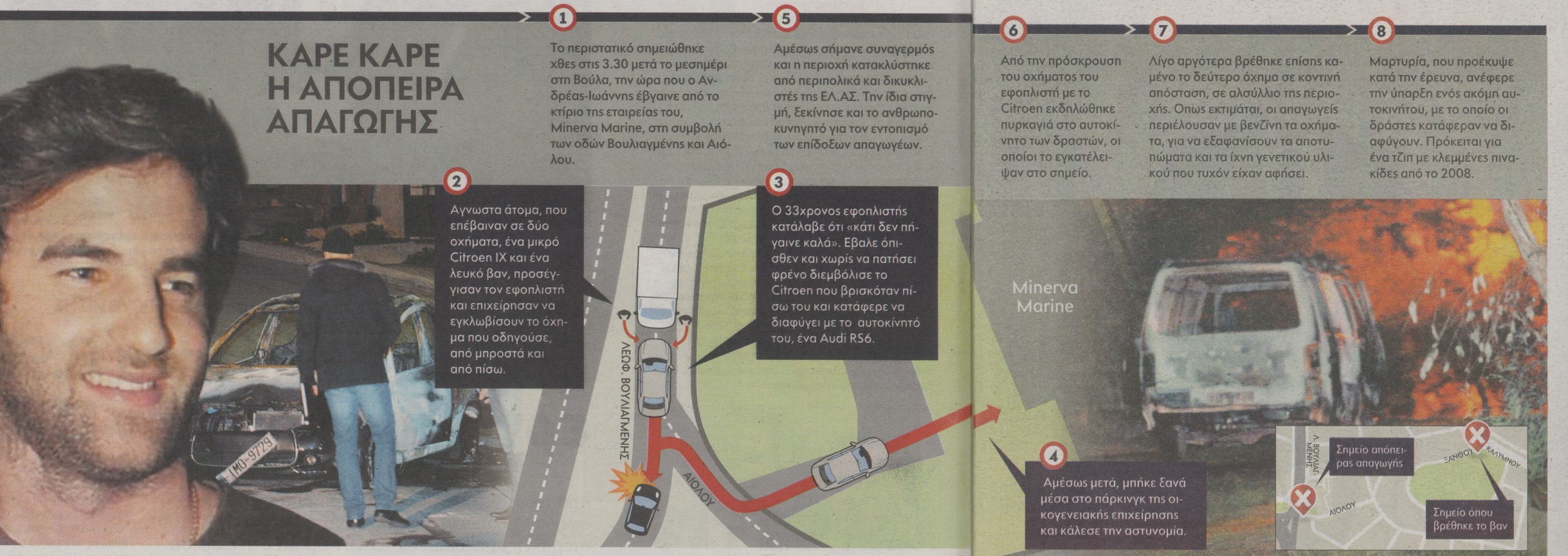 Το περιστατικό σημειώθηκε χθες το μεσημέρι στις 15.30 στη Λεωφόρο Βουλιαγμένης στο ύψος της Βούλας, την ώρα που ο Ανδρέας-Ιωάννης, Κίκος κατά τους οικείους του, έβγαινε από το κτίριο της εταιρείας του Minerva Marine, στην οδό Βουλιαγμένης και Αιόλου. Αγνωστα άτομα που επέβαιναν σε δύο οχήματα, ένα μικρό ΙΧ μάρκας Citroen και ένα λευκό βαν, προσέγγισαν τον εφοπλιστή και επιχείρησαν να εγκλωβίσουν το όχημα που οδηγούσε από μπροστά και από πίσω.