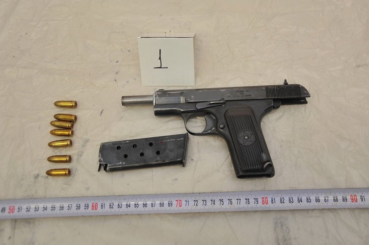 Στο εσωτερικό του οχήματος βρήκαμε και κατασχέσαμε, μεταξύ άλλων, ένα πιστόλι με γεμιστήρα και επτά φυσίγγια, ένα μαχαίρι, μία μπαλακλάβα, γάντια και δύο σκούφους, ενώ όπως προέκυψε από την εργαστηριακή εξέταση, έφερε πλαστές πινακίδες κυκλοφορίας και ο αριθμός πλαισίου του ήταν παραποιημένος.