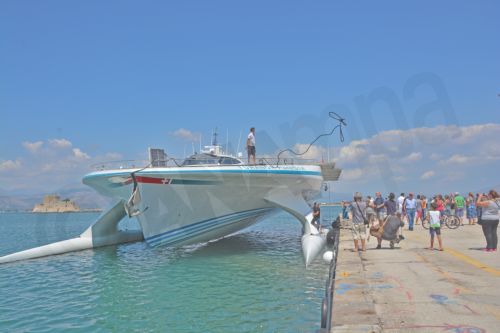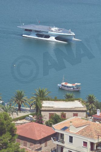 Το Καταμαράν Planet Solar με σημαία Ελβετίας που κινείται με ηλιακή ενέργεια κατέπλευσε σήμερα στο λιμάνι του Ναυπλίου.