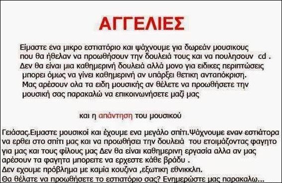 Με έναν ξεκαρδιστικό τρόπο επέλεξε ένας μουσικός από την Θεσσαλονίκη να απαντήσει στην αγγελία ιδιοκτήτη ταβέρνας που αναζητούσε καλλιτέχνες οι οποίοι θα παρείχαν χωρίς αμοιβή τις υπηρεσίες τους στο κατάστημά του.