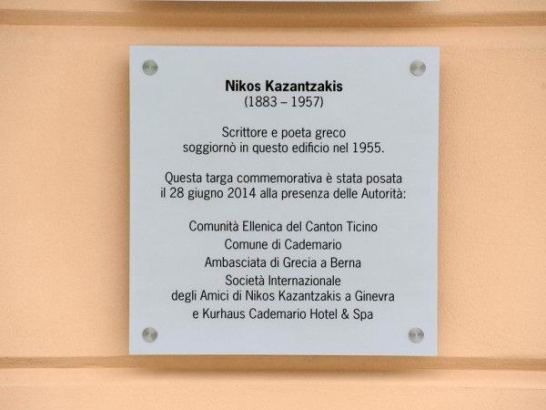 Αναμνηστική πλακέτα προς τιμή του μεγάλου Έλληνα συγγραφέα Νίκου Καζαντζάκη, αναρτήθηκε σε περίoπτη θέση ξενοδοχείου της ιταλόφωνης Ελβετίας, εκεί όπου το 1955 ξεκίνησε τη συγγραφή του έργου του «Αναφορά στο Γκρέκο».