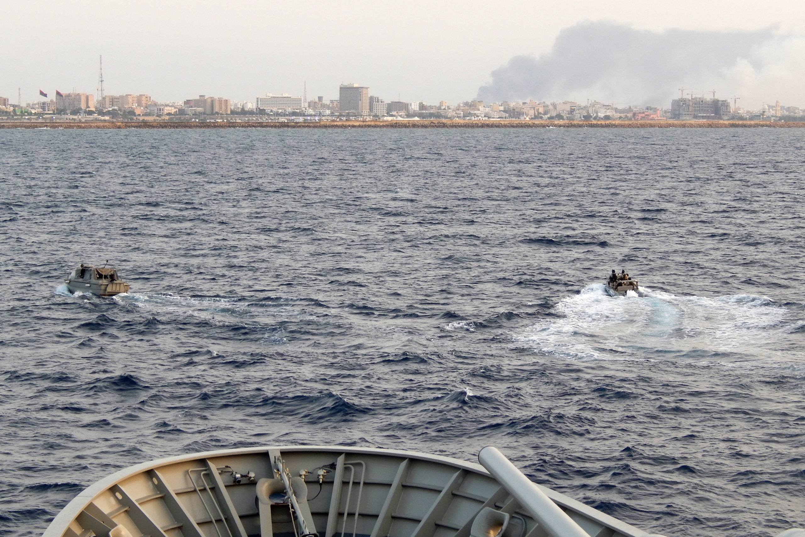 Αξιωματικοί του Πολεμικού Ναυτικού επιβιβάζουν πολίτες στη φρεγάτα «ΣΑΛΑΜΙΣ», κατά τη διάρκεια της επιχείρησης εκκένωσης από το λιμάνι της Τρίπολης, στη Λιβύη.