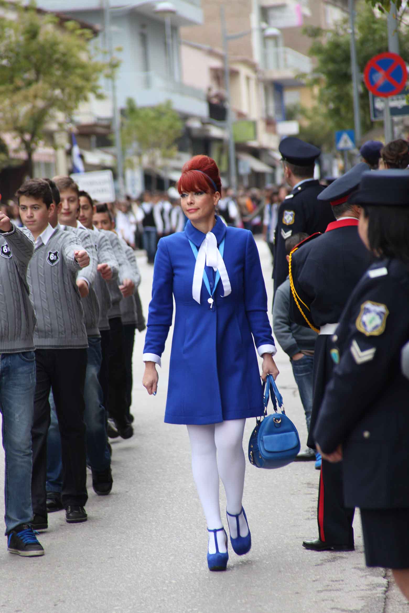 Συνοδεύοντας τους μαθητές και τις μαθήτριες του 6ου Γυμνασίου, η καθηγήτρια φυσικής αγωγής Σοφία Καλαμάρα έκλεψε όλα τα βλέμματα με την εντυπωσιακή της παρουσία, αλλά και την εμφάνιση στα χρώματα της γαλανόλευκης, ανήμερα της εθνικής μας επετείου.