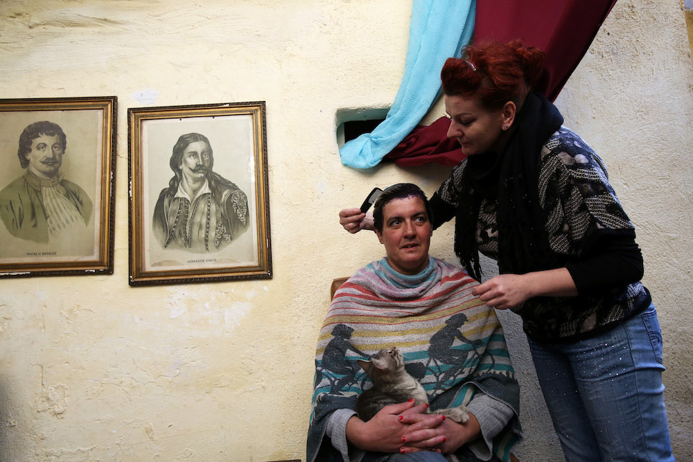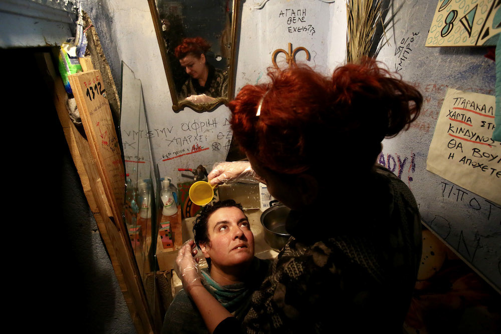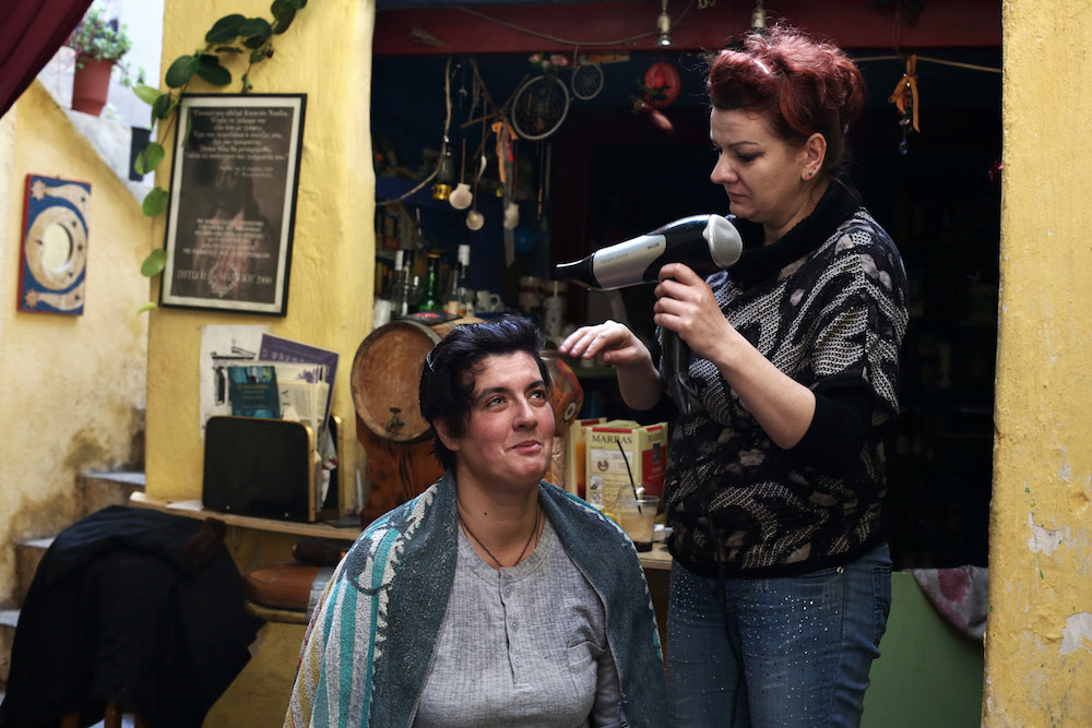 «Δεν έχω πληρωθεί ποτέ, το κάνω γιατί μου αρέσει», διευκρινίζει καθώς καλύπτει με τη βαφή, το ξεθωριασμένα κόκκινα μαλλιά της Μαρίας. Κάποτε τα έβαφε στο κομμωτήριο. Δούλευε τότε ως τηλεφωνήτρια, και ο μισθός της επαρκούσε για να δίνει «και 60 και 80 ευρώ για μαλλιά. Δεν είχα φανταστεί ότι θα περνούσα τόσο μεγάλες δυσκολίες, ότι θα βρισκόμουν στο δρόμο».