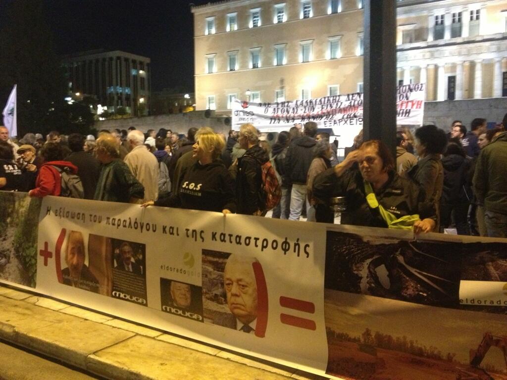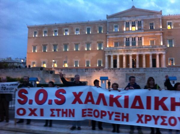 Σε εξέλιξη η πορεία διαμαρτυρίας για την εξόρυξη χρυσού στις Σκουριές που ξεκίνησε στις 17.00 από τα Προπύλαια. Η επιτροπή αγώνα των κατοίκων, που βρίσκεται στην Αθήνα, παραχώρησε συνέντευξη τύπου στα γραφεία της ΕΣΗΕΑ και εν συνεχεία κατευθύνθηκε προς τη Βουλή για να επιδώσει τα αιτήματα των κατοίκων της Χαλκιδικής.