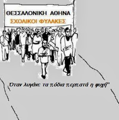 Περπάτησαν πεζή από τη Θεσσαλονίκη έως την Αθήνα και διέσχισαν 560 χιλιόμετρα σε 24 ημέρες. Οι 12 σχολικοί φύλακες επέλεξαν να εκφράσουν με αυτό τον τρόπο την διαμαρτυρία τους για το γεγονός ότι τέθηκαν σε διαθεσιμότητα.