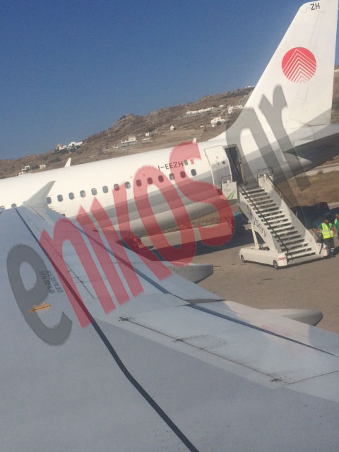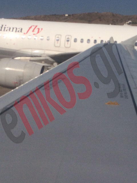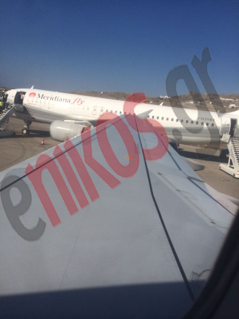 Όπως δείχνει μία από τις αποκλειστικές φωτογραφίες του enikos.gr, το φτερό του αεροπλάνου της πτήσης 378 της Aegean Airlines στον αεροδιάδρομο της Μυκόνου ακουμπά επάνω στο φτερό του αεροσκάφους των ιταλικών αερογραμμών Meridiana.