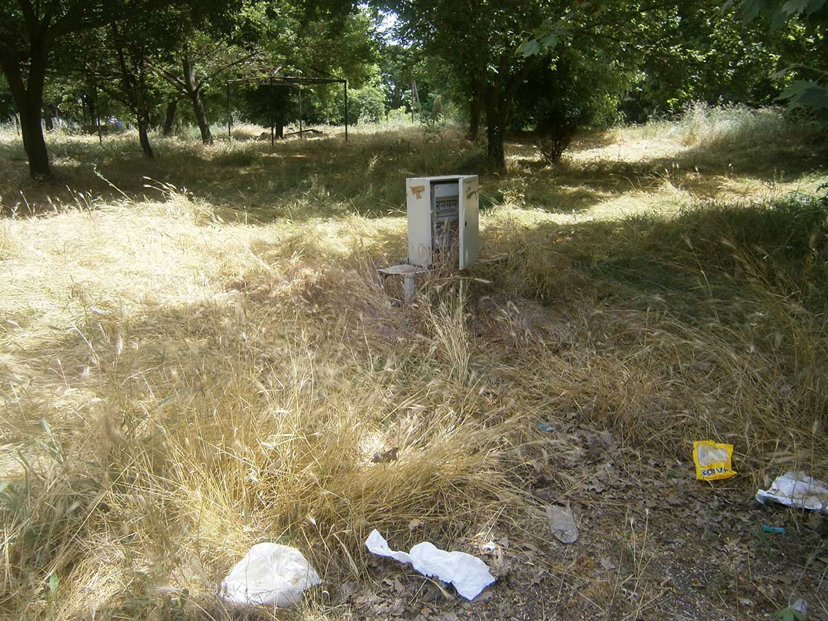 Τα σκουπίδια, τα σπασμένα γυαλιά, τα ξερά χόρτα, «συνθέτουν» ένα μη ειδυλλιακό σκηνικό το οποίο γίνεται ακόμη πιο επικίνδυνο εξαιτίας ενός σπασμένου ηλεκτρικού πίνακα που εγκυμονεί κινδύνους για μικρά παιδιά.