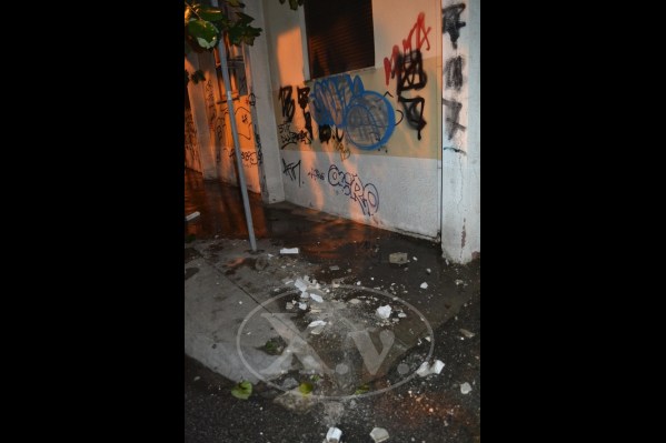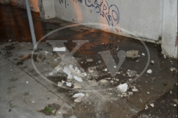Ευτυχώς τη στιγμή που μεγάλα κομμάτια τσιμέντο και σοβά έπεφταν στο πεζοδρόμιο δεν περνούσε κάποιος πεζός.