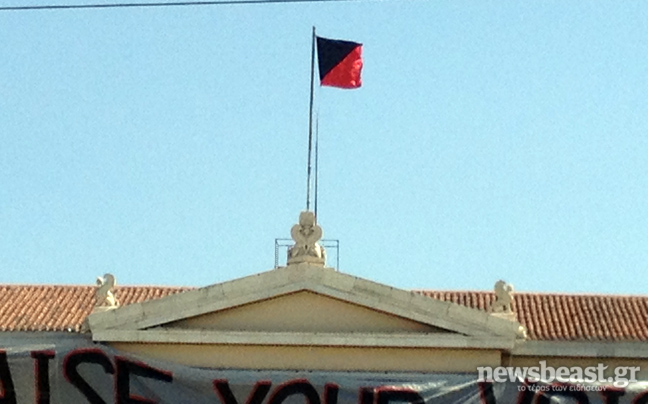 Άτομα του αντιεξουσιαστικού χώρου κατέβασαν πριν από λίγο την ελληνική σημαία από τον ιστό, στα Προπύλαια, και ανήρτησαν τη σημαία τους.