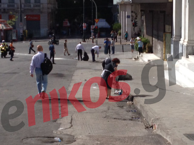 Οι ομάδες των διαδηλωτών αποχωρούν σιγά σιγά από το Σύνταγμα και εργαζόμενες των ξενοδοχείων καθαρίζουν τον δρόμο.