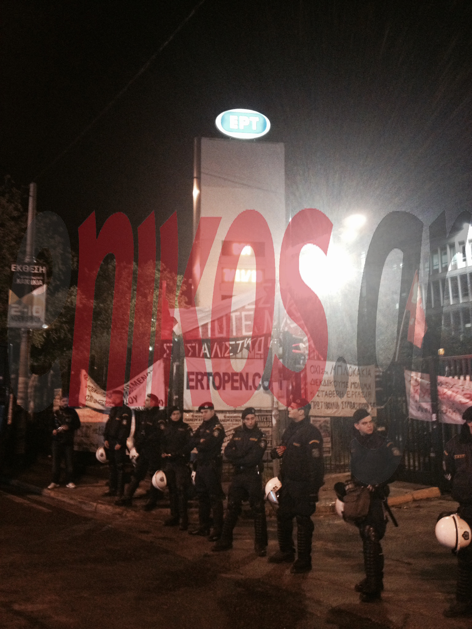 Περίπου 100 άτομα έχουν συγκεντρωθεί έξω από την είσοδο του Ραδιομεγάρου, στην Αγία Παρασκευή, όπως διακρίνεται και στις φωτογραφίες από το σημείο.