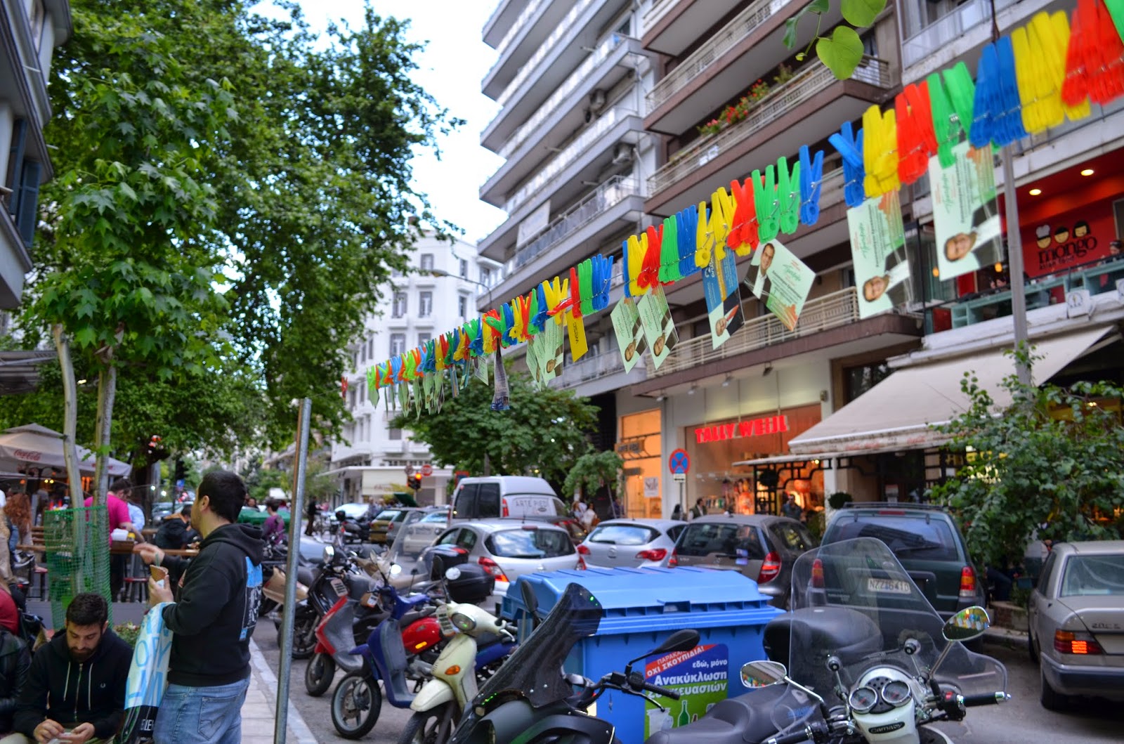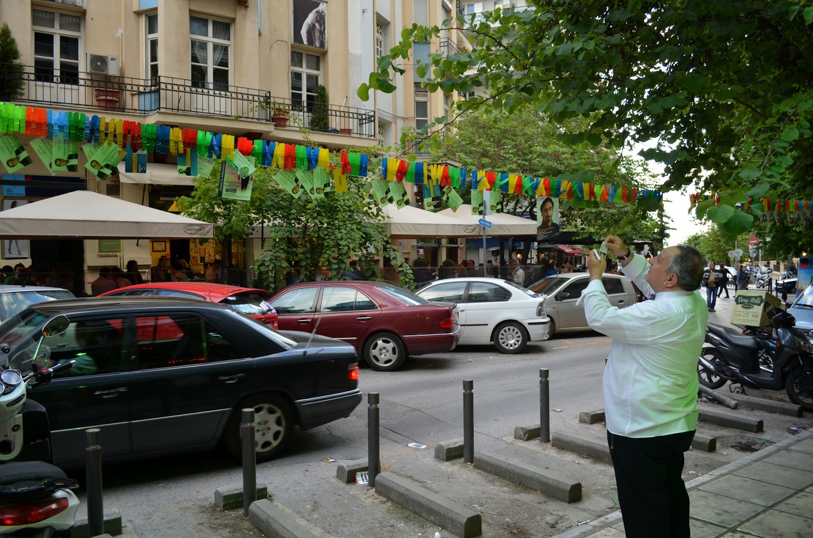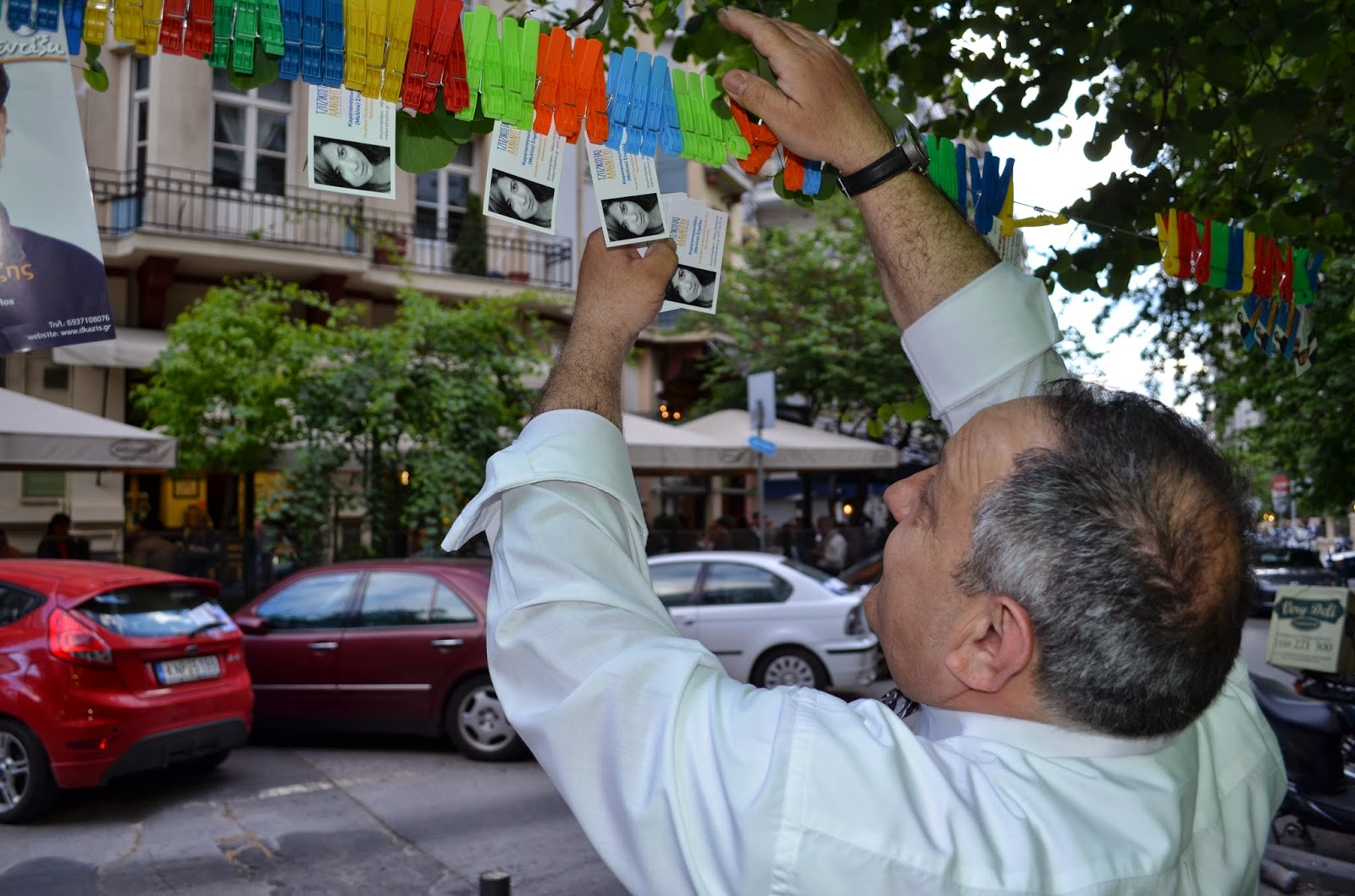 Ο ιδιοκτήτης του καταστήματος κρέμασε με μανταλάκια το προεκλογικό υλικό (κάρτες και φυλλάδια) όλων των υποψηφίων ώστε να μπορούν οι περαστικοί από την οδό Κούσκουρα, όπου βρίσκεται το εστιατόριο, να τους βλέπουν και να τους… θαυμάζουν.