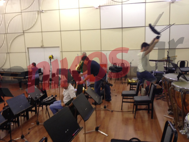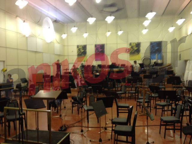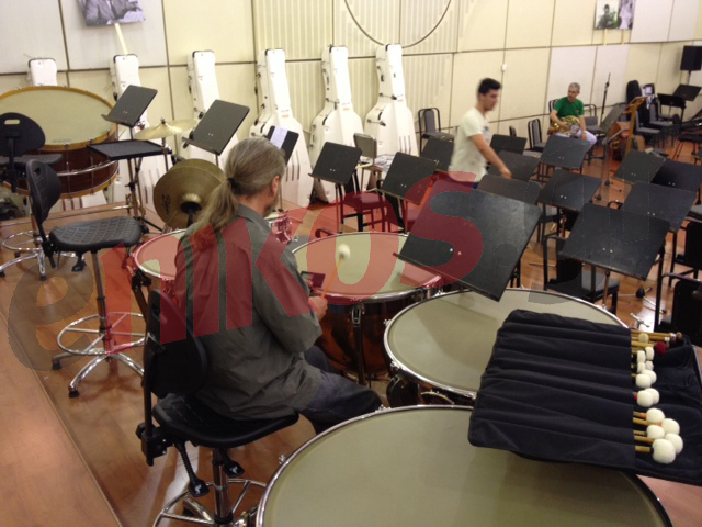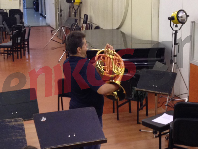 Σχεδόν μια ώρα πριν από τη μεγάλη συναυλία στην ΕΡΤ, τα μέλη της Εθνικής ορχήστρας επιβλέπουν τις τελευταίες λεπτομέρειες και κάνουν τις πρόβες τους.