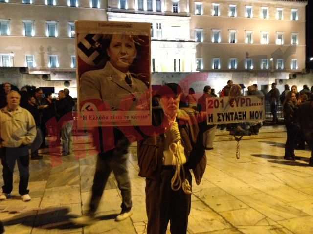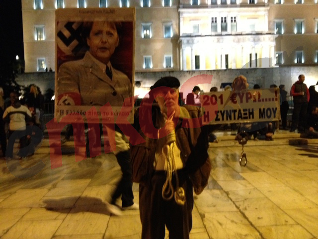 Ένας διαδηλωτής βρήκε έναν διαφορετικό τρόπο για να διαμαρτυρηθεί! Έχει περάσει μια κρεμάλα στο λαιμό του, στο δεξί του χέρι κρατάει ένα πλακάτ με την Μέρκελ ντυμένη Χίτλερ και στο αριστερό ένα πλακάτ με τα χρήματα της σύνταξής του…