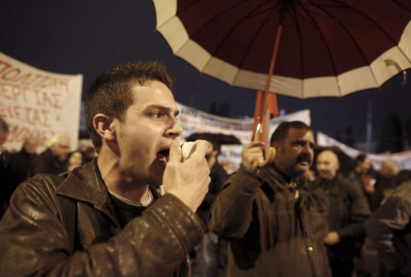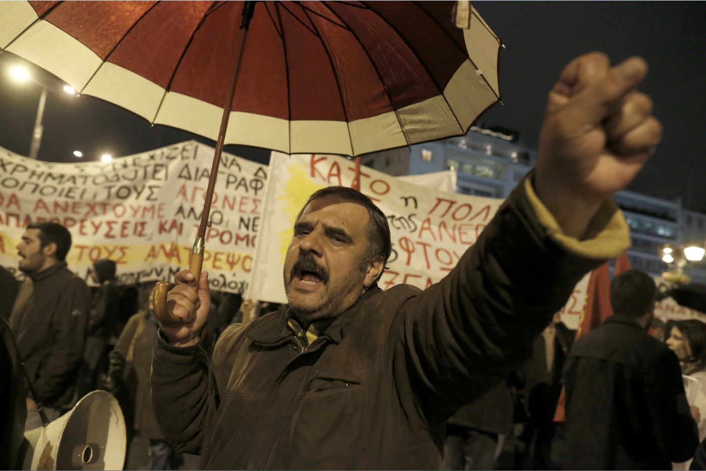 Παρά τη βροχή οι διαδηλωτές παραμένουν έξω από τη Βουλή κρατώντας ομπρέλες και φωνάζοντας συνθήματα κατά της κυβερνητικής πολιτικής.