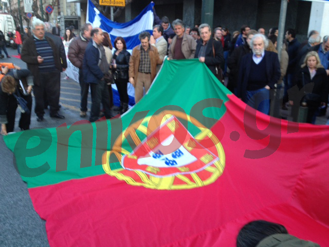 Οι διαδηλωτές, σήκωσαν μεγάλες σημαίες των χωρών που αντιμετωπίζουν τα μεγαλύτερα προβλήματα, από την οικονομική κρίση που “θερίζει” την Ευρωζώνη.