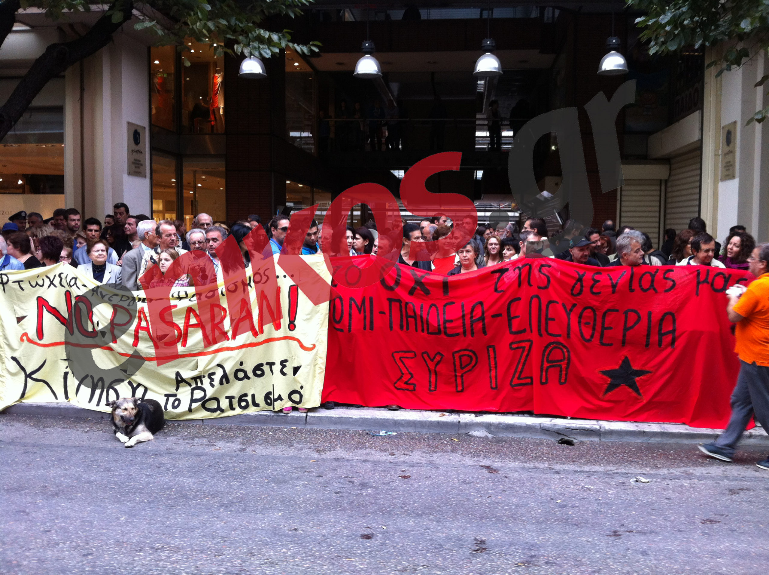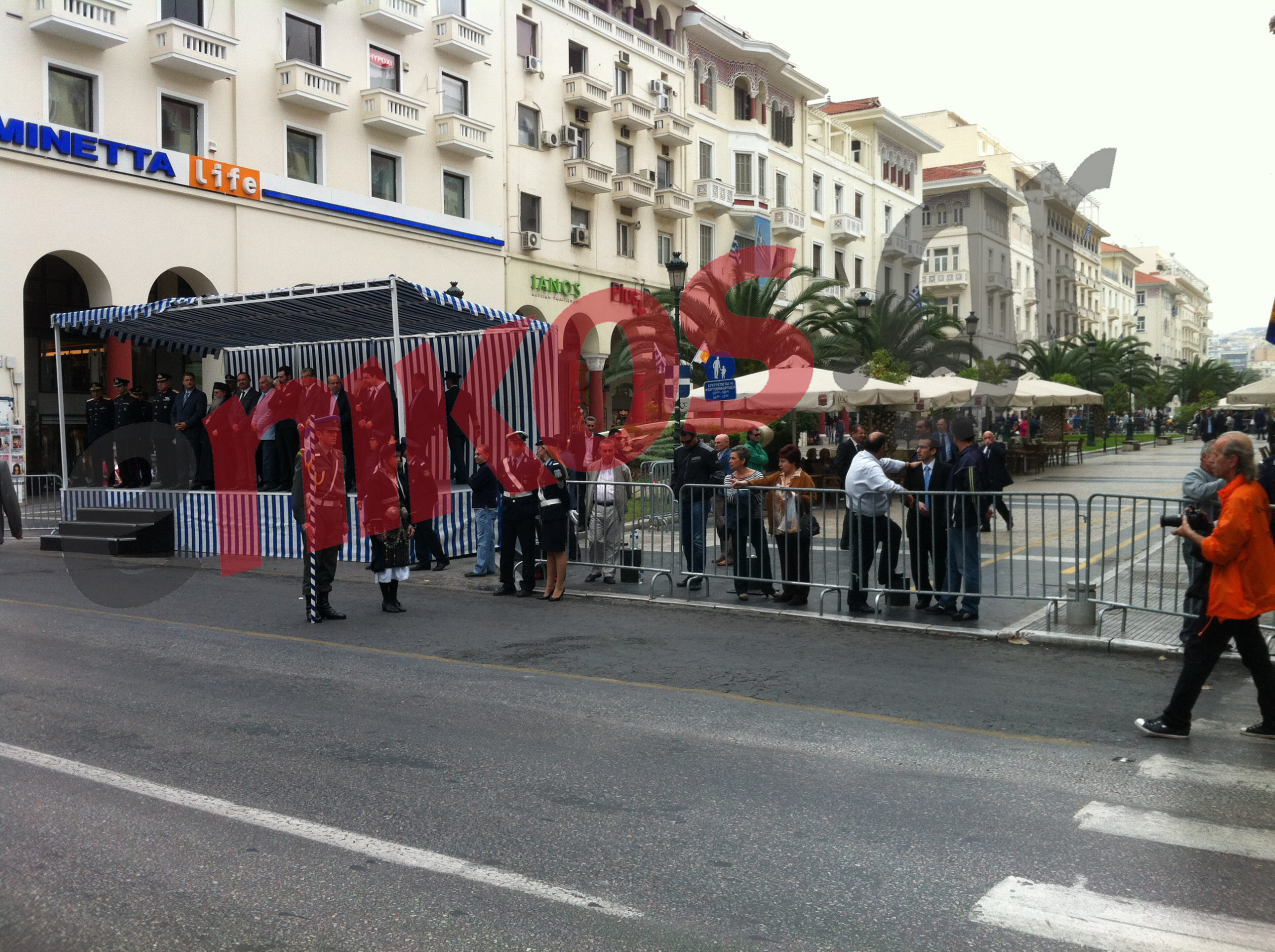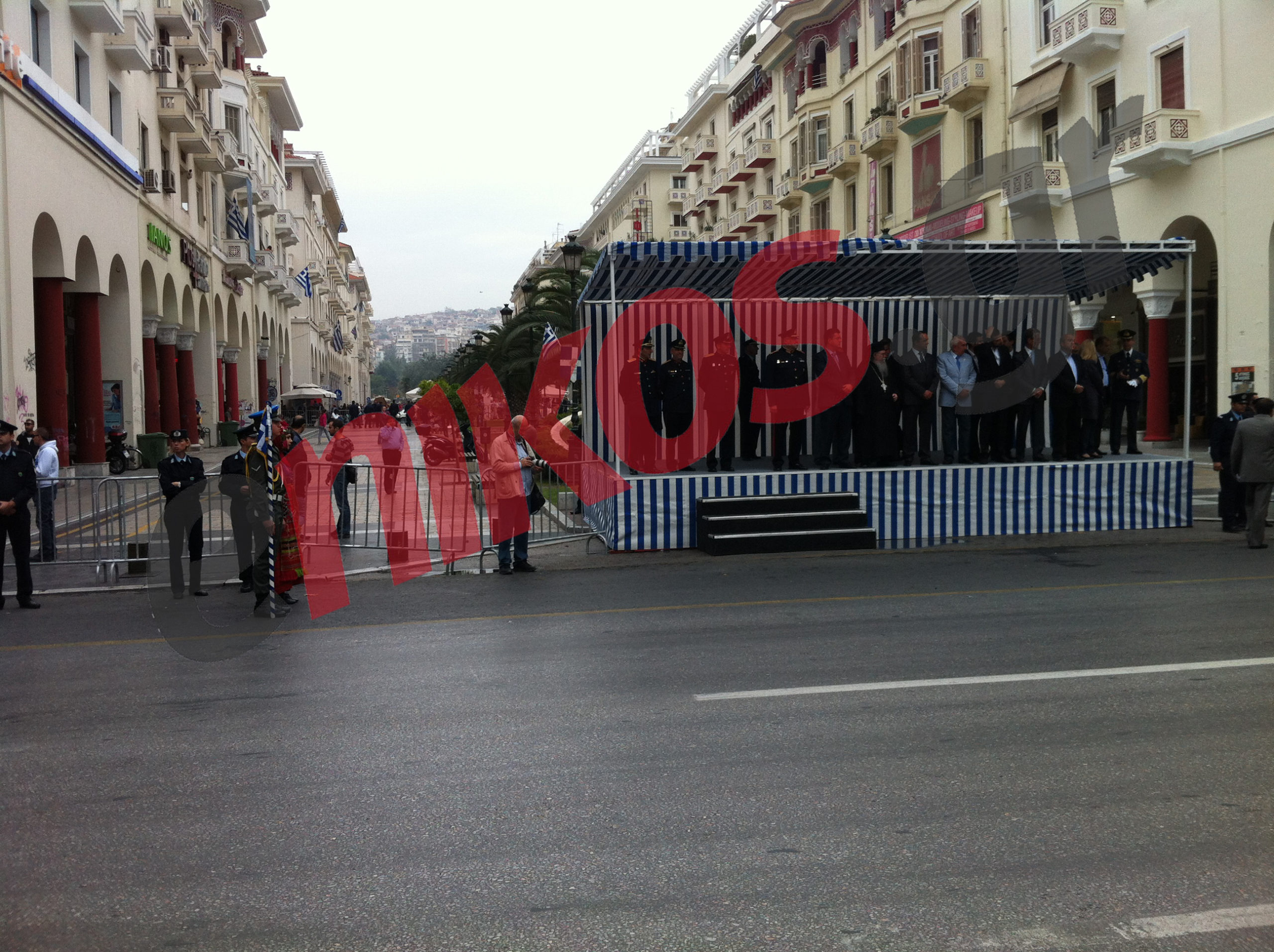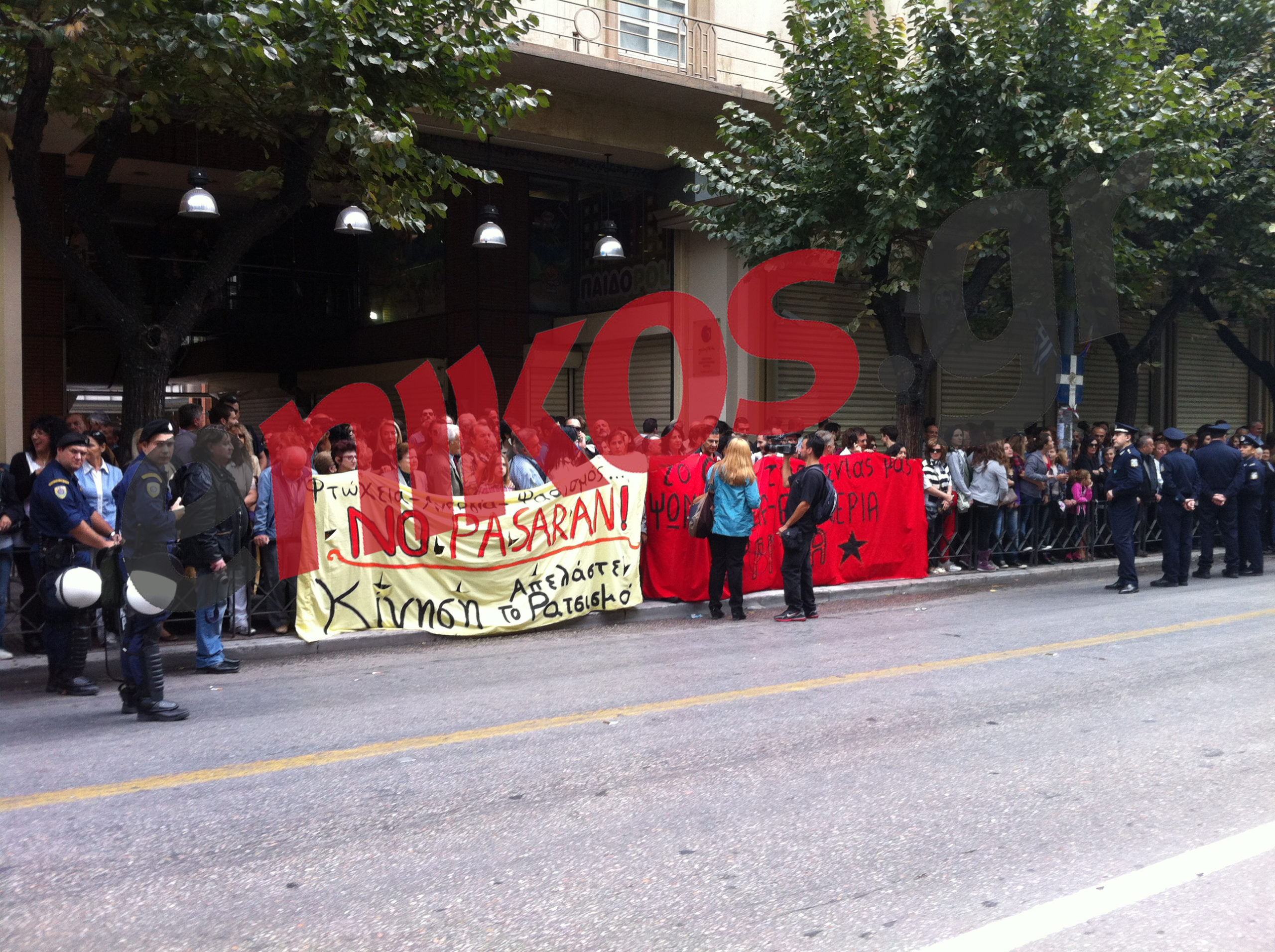 Μέλη του ΣΥΡΙΖΑ διαδηλώνουν στα 100μ. από την εξέδρα των επισήμων στην μαθητική παρέλαση της Θεσσαλονίκης.