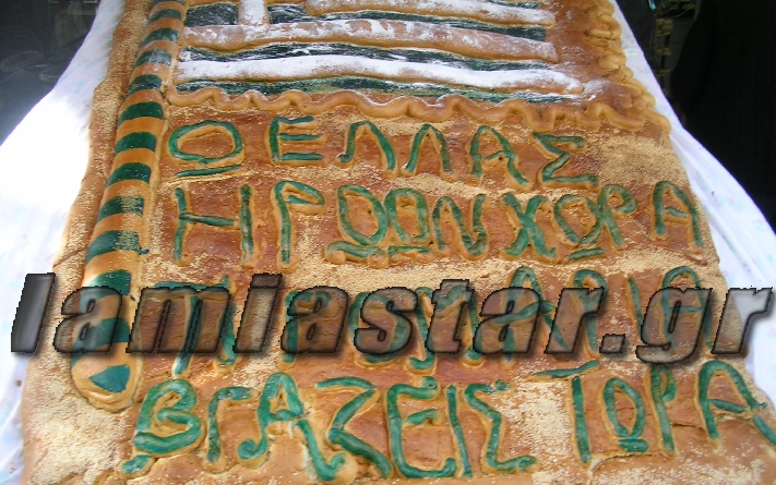 Με μια λαγάνα το βάρος της οποίας φτάνει τα 150 κιλά, ο κύριος Αντωνίου και οι συνεργάτες του, δανειζόμενοι μία φράση του Σουρή, απευθύνονται στους πολιτικούς ως εξής: “Ω Ελλάς ηρώων χώρα, τι γομάρια βγάζεις τώρα”.