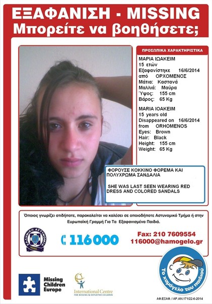 Από τις 16/06/2014 αγνοείται η 15χρονη Μαρία Ιωακείμ που έφυγε από το σπίτι της κατά τις πρωινές ώρες, στους Αγίους Θεοδώρους Ορχομενού.