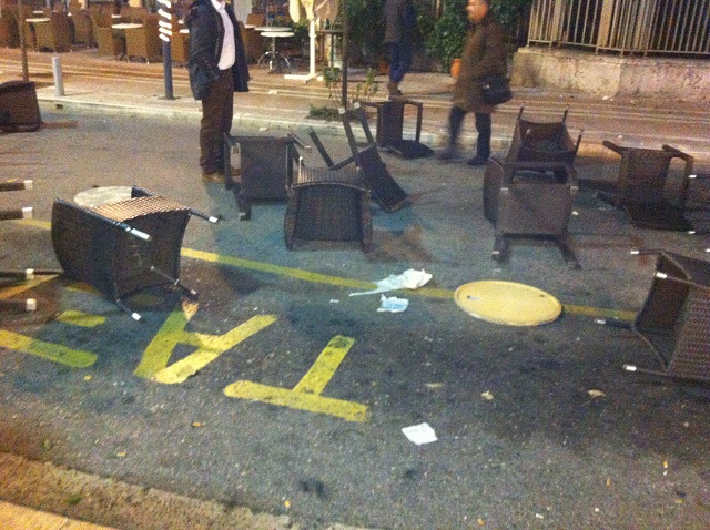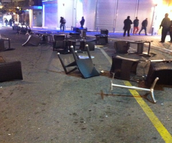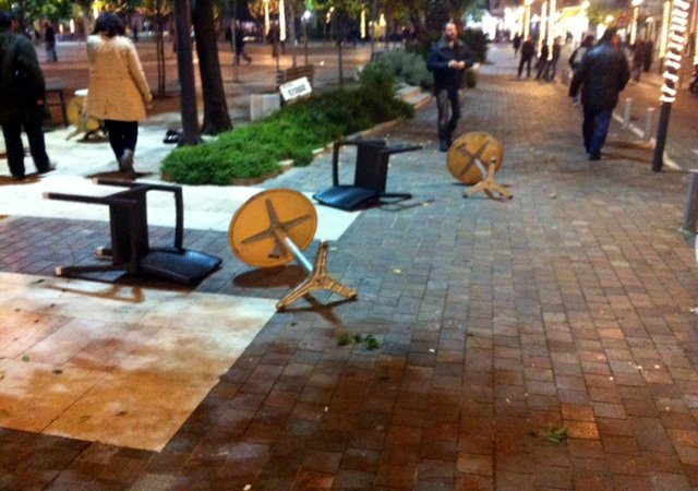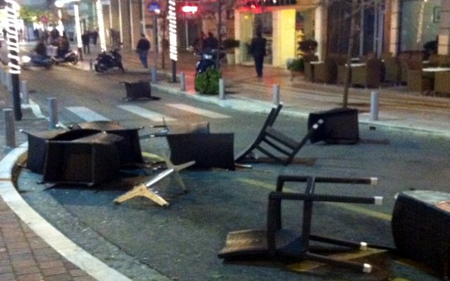 Όπως φαίνεται και στις φωτογραφίες που δημοσίευσε το agriniopress.gr, οι δρόμοι της πόλης γέμισαν με σπασμένα γυαλιά και καρέκλες από τις παρακείμενες καφετέριες.