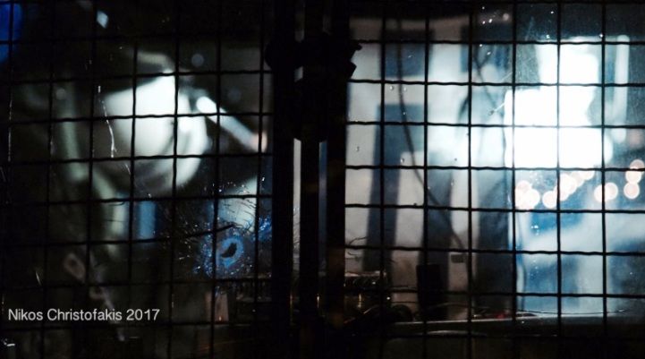 Στη φωτογραφία που έχει αναρτήσει στο twitter ο φωτογράφος-φωτορεπόρτερ Νίκος Χριστοφάκης φαίνεται το θραύσμα από τη βολή με καλάσνικοφ στο παρμπρίζ του λεωφορείου των ΜΑΤ.