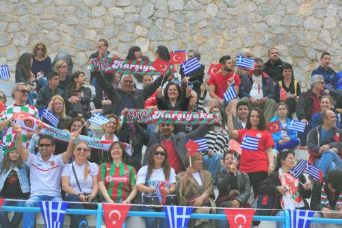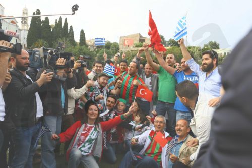 Αναμεμιγμένοι μεταξύ τους στις εξέδρες, με τούρκικες και ελληνικές σημαίες στα χέρια, με κασκόλ και των δύο ομάδων και ένα μεγάλο πανό που έγραφε στα ελληνικά και τα τουρκικά «Η φιλία να νικήσει» οι φίλαθλοι έστησαν στο γήπεδο μια μεγάλη γιορτή. Η υποδοχή που επεφύλαξαν οι ντόπιοι στους επισκέπτες ήταν εξίσου πανηγυρική: η προκυμαία είχε σημαιοστολιστεί ενώ είχαν αναρτηθεί τα εθνικά σύμβολα και των δύο χωρών. Μαύρη παραφωνία ενάντια στην επιθυμία του χιώτικου λαού υπήρξαν μερικοί οπαδοί της νεοναζιστικής Χρυσής Αυγής, οι οποίοι έκαναν προκλητική εμφάνιση στο γήπεδο αλλά απομονώθηκαν από τις αστυνομικές δυνάμεις.