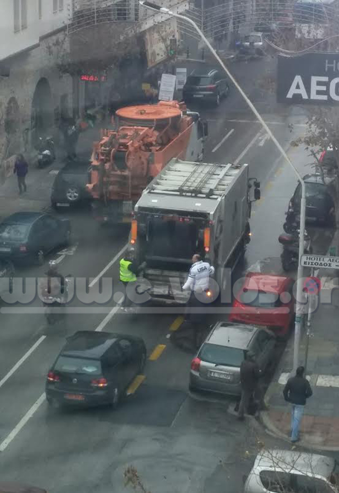 Ο νέος Δήμαρχος Βόλου Αχιλλέας Μπέος ανέβηκε στην πίσω πλευρά απορριμματοφόρου, το οποίο κινήθηκε στους κεντρικούς δρόμους της πόλης.
