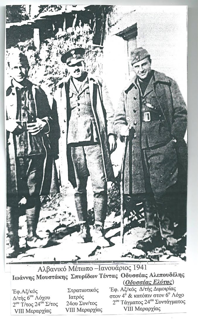 Στο μέτωπο, στην πρώτη ή στη δεύτερη γραμμή, βρίσκονται, εκτός από τον Ελύτη, ο ζωγράφος Γ. Τσαρούχης, ο Αγγ. Τερζάκης, ο Στ. Ξεφλούδας, ως έφεδρος ανθυπολοχαγός, οι συγγραφείς και ποιητές Γ. Σαραντάρης, Ν. Καββαδίας Ν. Εγγονόπουλος, Γ. Μπεράτης (αρχές του ’41), Λ. Ακρίτας, Ν. Βρεττάκος, Α. Κοβατζής, Α. Καραντώνης, οι νεότεροι Αγγ. Βλάχος, Τ. Σινόπουλος, Αρ. Δικταίος, Λευτ. Ιερόπαις, κ.ά.