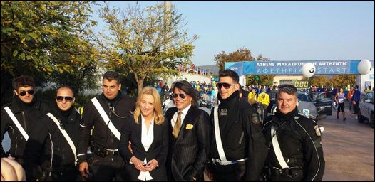 Στην αφετηρία του 32ο Κλασσικού Μαραθωνίου, βρέθηκε ο δήμαρχος Μαραθώνα, ενώ όπως φαίνεται και στη φωτογραφία που ανήρτησε στον προσωπικό του λογαριασμό στο Twitter, έχει στην αγκαλιά του την Περιφερειάρχη Αττικής, Ρένα Δούρου και περιβάλλεται από πέντε άνδρες της τροχαίας.