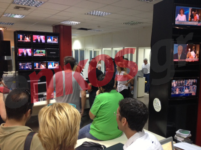 Οι εργαζόμενοι της ΕΡΤ παρακολούθησαν τις δηλώσεις του προέδρου του ΠΑΣΟΚ, Ευάγγελου Βενιζέλου, μετά τη σύσκεψη των τριών πολιτικών αρχηγών.