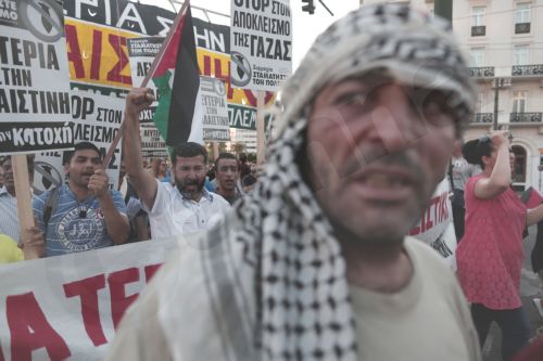 Η διαδήλωση αλληλεγγύης στον Παλαιστινιακό λαό ξεκίνησε με συγκέντρωση από τις 19:00 στο Σύνταγμα και λίγο μετά τις 20:00 οι διαδηλωτές πραγματοποίησαν πορεία προς την Αμερικάνικη Πρεσβεία, φωνάζοντας συνθήματα διαμαρτυρίας για τους βομβαρδισμούς στη Λωρίδα της Γάζας.