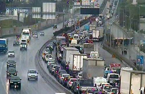 Λόγω της έντονης βροχόπτωσης, δημιουργείται μεγάλο μποτιλιάρισμα, με αποτέλεσμα τα αυτοκίνητα να κινούνται με ιδιαίτερα χαμηλές ταχύτητες.