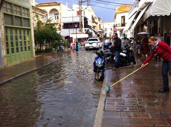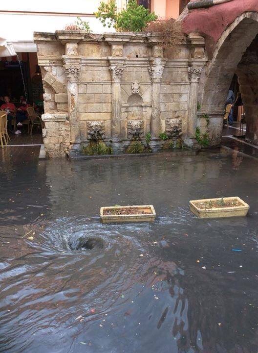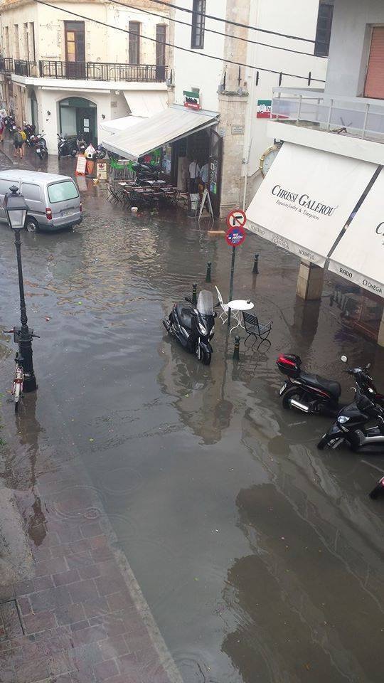 Η καταρρακτώδης βροχή που έπεσε μέσα σε λίγα λεπτά στην πόλη του Ρεθύμνου, την Παρασκευή, προκάλεσε πολλά προβλήματα κυρίως στην παλιά πόλη, δρόμοι της οποίας κατακλύστηκαν από τα νερά.