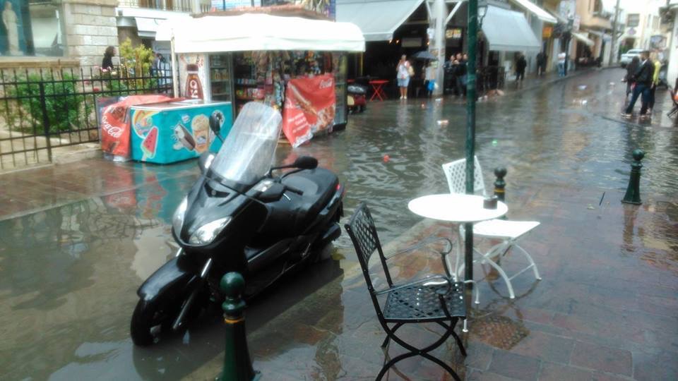 Η κυκλοφορία των οχημάτων γινόταν με δυσκολία, ενώ καταστηματάρχες και κάτοικοι προσπαθούσαν να κρατήσουν τα νερά έξω από σπίτια και επιχειρήσεις.