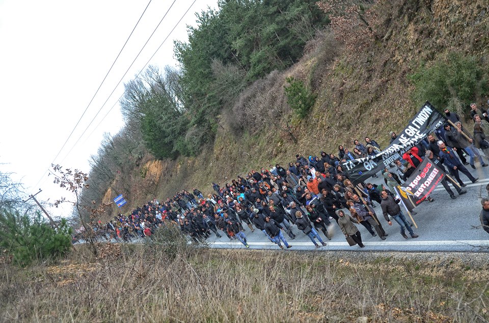 Πορεία προς την περιοχή Χοντρό Δέντρο πραγματοποίησαν οι κάτοικοι στις Σκουριές Χαλκιδικής, που διαμαρτύρονται για τη δημιουργία μεταλλείων Χρυσού στην περιοχή τους.