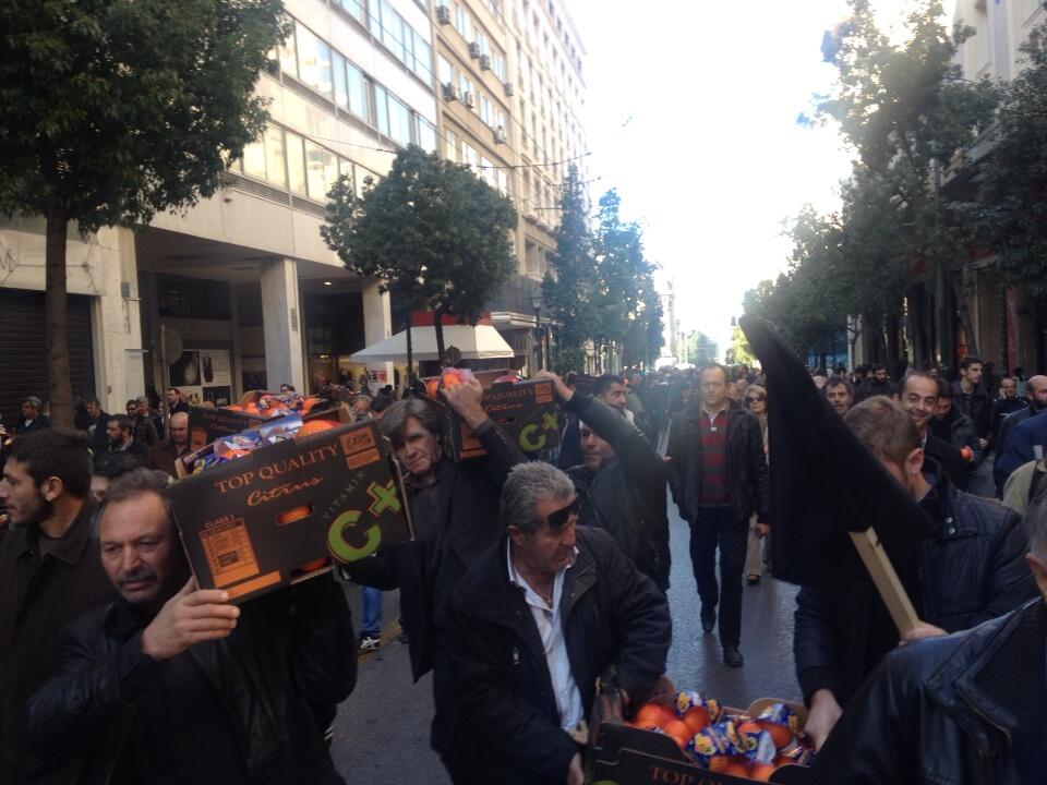 Οι αγρότες πήραν τα πορτοκάλια από ακινητοποιημένο φορτηγό και αντί να τα διανείμουν στους πολίτες, τα εκτόξευσαν προς την μεριά των αστυνομικών.