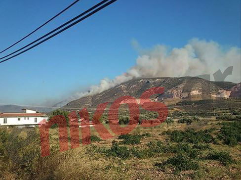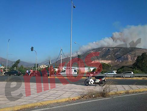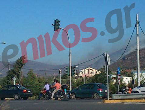 Οι κάτοικοι της περιοχής του Μαρκόπουλου έχουν βγει στο δρόμο αναστατωμένοι και κοιτάζουν στο σημείο, που η φωτιά κατακαίει το βουνό.