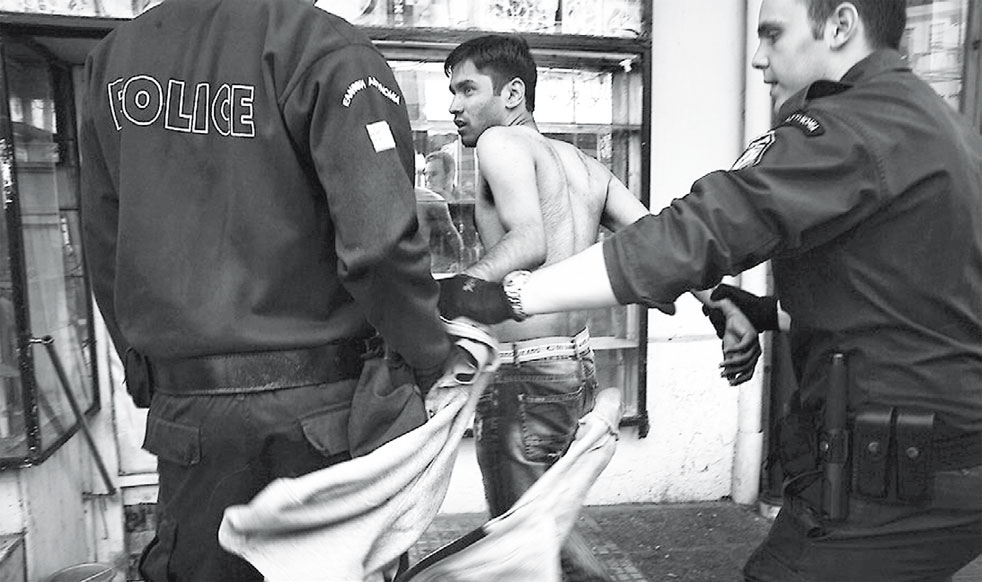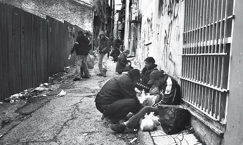 Ένας ηλικιωμένος ρουφάει ό,τι έχει απομείνει από το πλαστικό κυπελάκι του συσσιτίου. Ένα ζευγάρι τοξικομανών αγκαλιάζεται τρυφερά σε μια οικοδομή. Δύο αστυνομικοί τραβούν έναν διαδηλωτή.