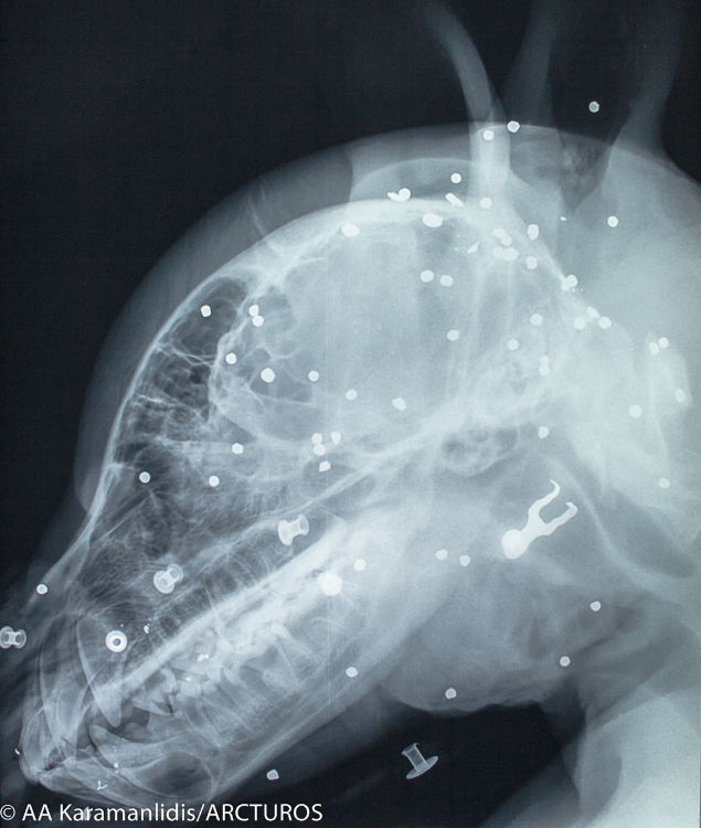 Ο “Γιώργος” μεταφέρθηκε, την Τρίτη, από την Ομάδα Άμεσης Επέμβασης του Αρκτούρου στη Μονάδα Εξωτικών και Άγριων Ζώων και στη Μονάδα Αναισθησιολογίας και Εντατικής Θεραπείας της Κτηνιατρική Σχολής του ΑΠΘ για τις απαραίτητες εξετάσεις. Έπειτα από κλινική εξέταση και τη λήψη ακτινογραφιών διαπιστώθηκε κρανιοεγκεφαλική κάκωση, ενώ παράλληλα βρέθηκαν και άφθονα βλήματα πυροβόλου όπλου στην περιοχή της κεφαλής και του θώρακα.