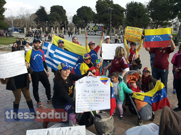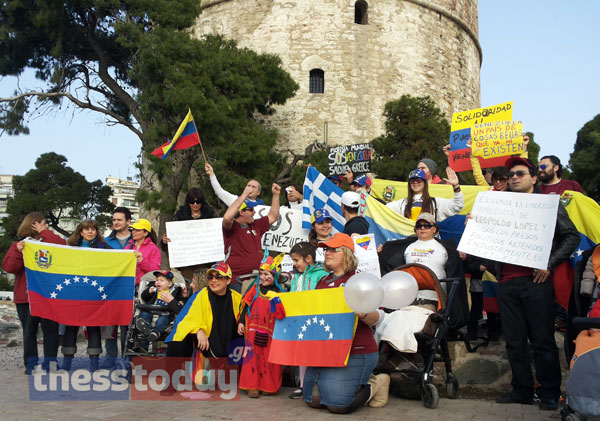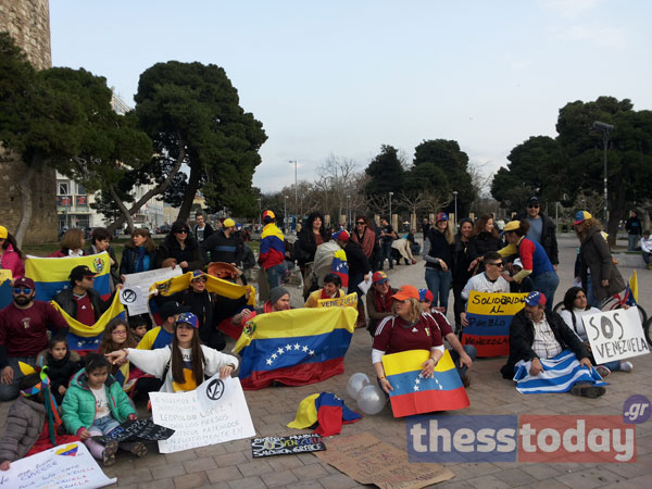 Συγκέντρωση διαμαρτυρίας, στον Λευκό Πύργο πραγματοποίησαν υπήκοοι της Βενεζουέλας που ζουν στη Θεσσαλονίκη εκφράζοντας την αντίδραση τους στον πρόεδρο της χώρας Μαδούρο για την πολιτική που εφαρμόζει, η οποία αποτέλεσε και την σπίθα για να ξεσπάσουν βίαιες ταραχές με νεκρούς και τραυματίες.