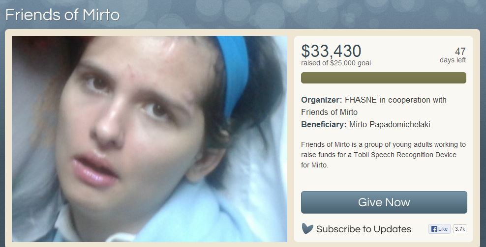 Συγκίνηση προκαλεί η ανταπόκριση του κόσμου στο κάλεσμα βοηθείας που απηύθυναν φίλοι της Μυρτούς προκειμένου να συγκεντρωθούν χρήματα για ένα ειδικό μηχάνημα, το οποίο θα τη βοηθήσει στη διατροφή και στην επικοινωνία.