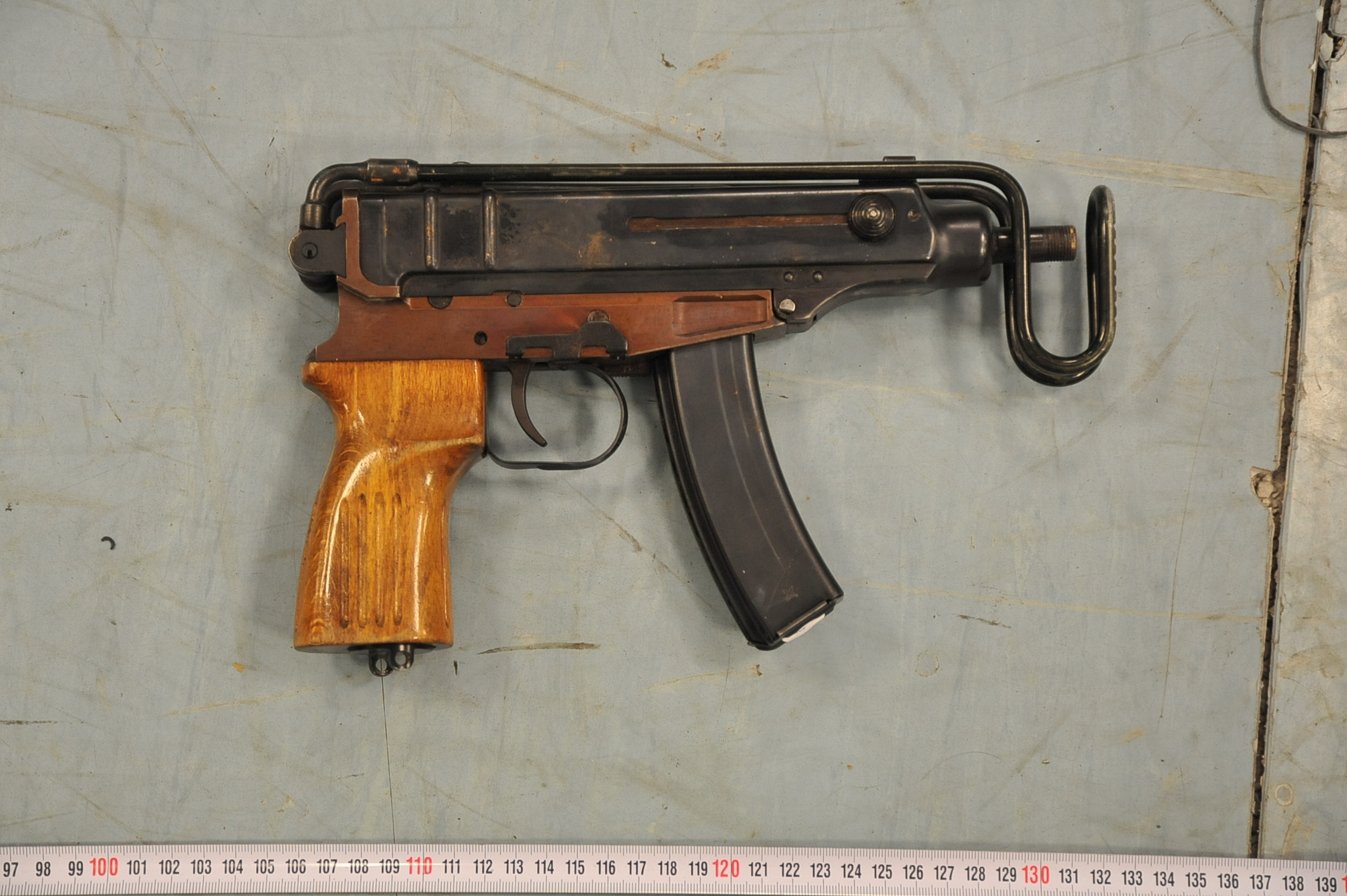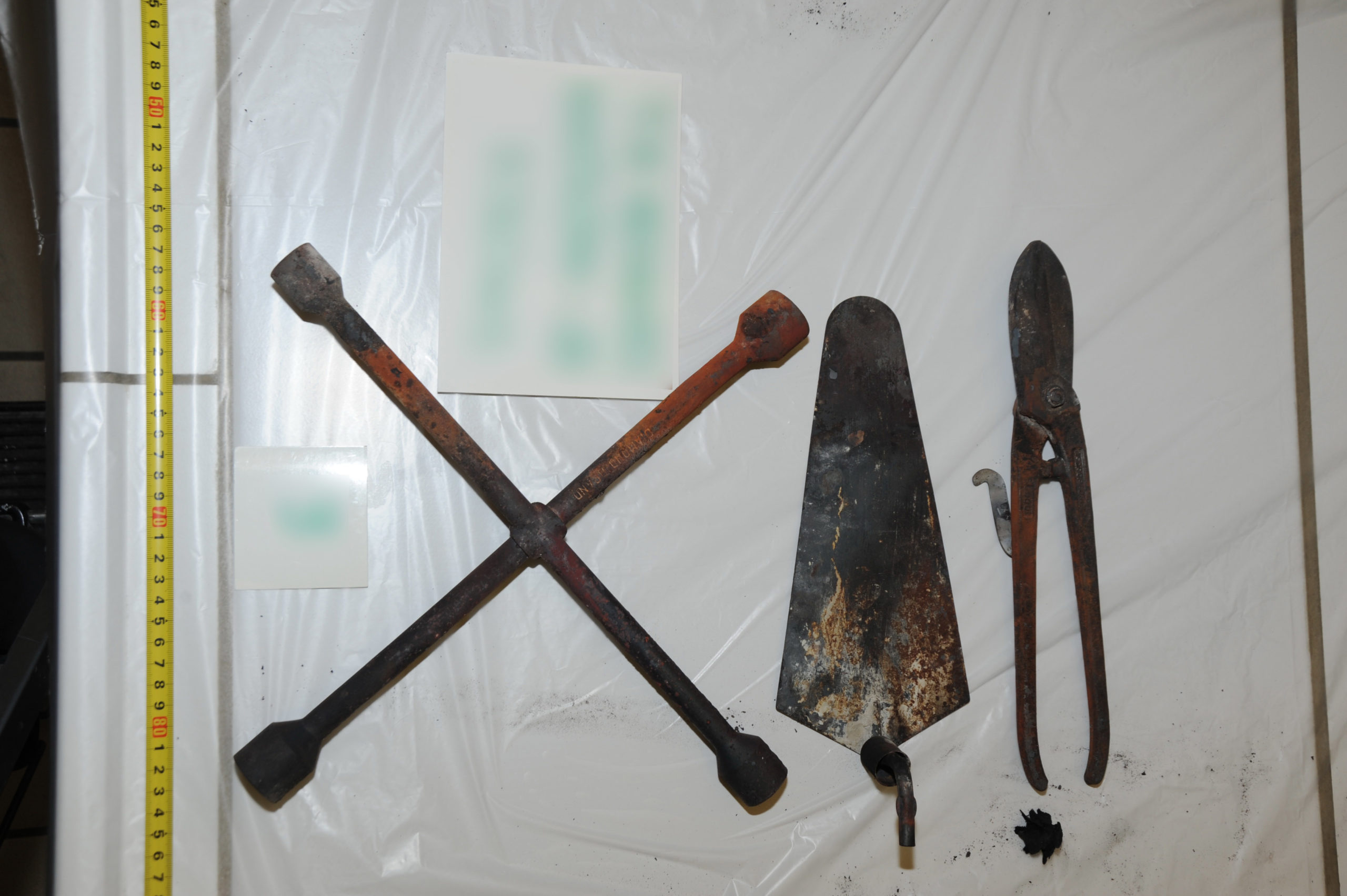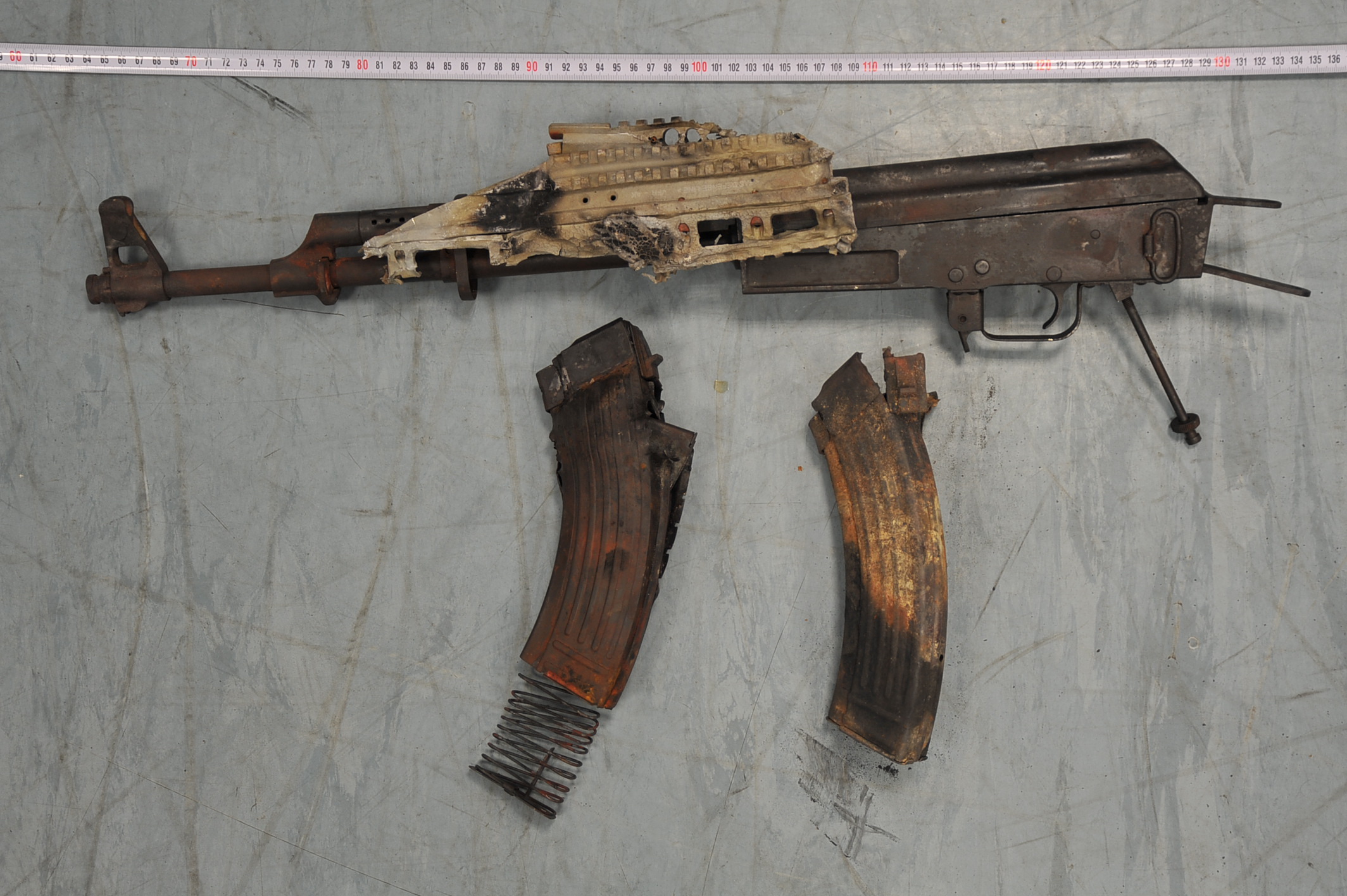 - τρία πολεμικά τυφέκια, τύπου Kalashnikov (το ένα φέρει εμφανή σημάδια-φθορές από πυρκαγιά που έβαλε ο δράστης στο όχημα τύπου «κλούβα» που προσομοίαζε με ασθενοφόρο)