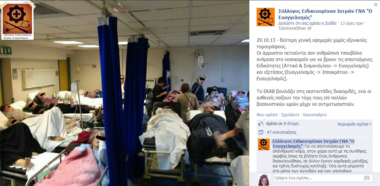 «Οι άρρωστοι πετιούνται σαν ανθρώπινα τσουβάλια ανάμεσα στα νοσοκομεία για να βρουν τις απαιτούμενες Ειδικότητες (Αττικό & Σισμανόγλειο-> Ευαγγελισμός) και εξετάσεις (Ευαγγελισμός-> Ιπποκράτειο-> Ευαγγελισμός)» καταγγέλλει ο Σύλλογος Ειδικευομένων Ιατρών του Ευαγγελισμού, μέσω της σελίδας τους στο facebook, σημειώνοντας για χθες, ότι «είναι η δεύτερη γενική εφημερία χωρίς αξονικούς τομογράφους».
