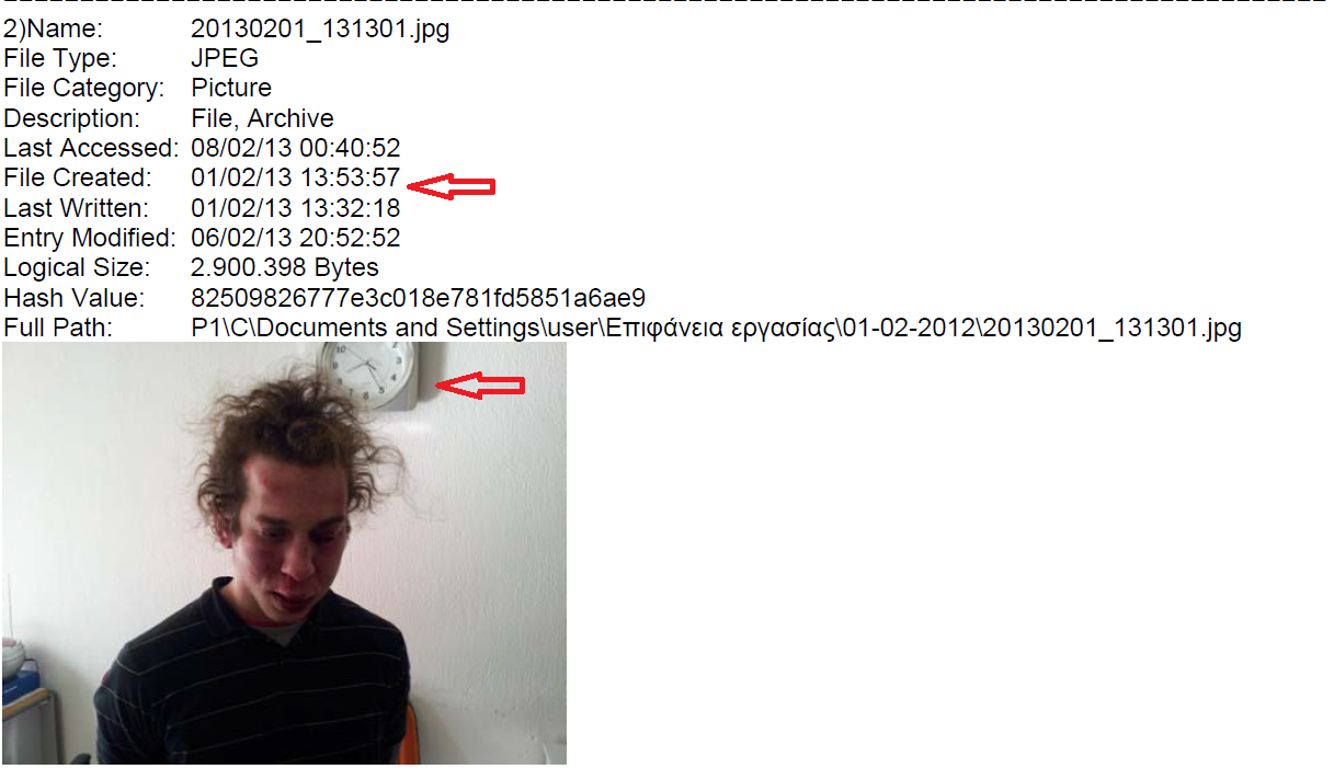 Στη φωτογραφία όμως που εικονίζει τον Ανδρέα-Δημήτρη Μπουρζούκο, όπως αναφέρει ο αναγνώστης του enikos.gr που έστειλε τις φωτογραφίες, το ρολόι πίσω από τον συλληφθέντα δείχνει 08.25.Μάλιστα ο αναγνώστης του enikos.gr εντόπισε και το σχετικό αρχείο με το φωτογραφικό υλικό από το site της αστυνομίας που δείχνει ακριβώς και την ώρα λήψης της φωτογραφίας. Με τα κόκκινα βελάκια έχει τις “διαφορές”.