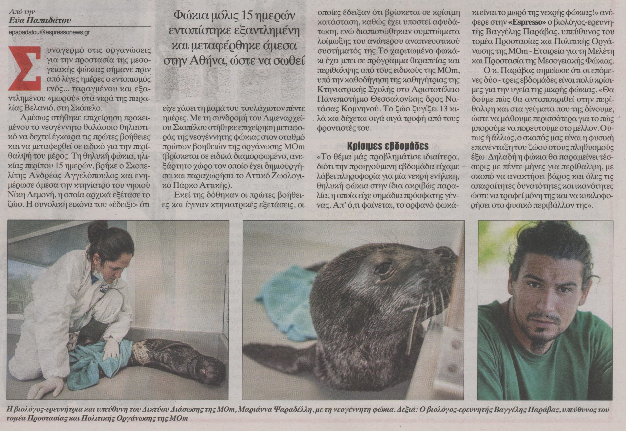 Αμέσως στήθηκε επιχείρηση προκειμένου το νεογέννητο θαλάσσιο θηλαστικό να δεχθεί έγκαιρα τις πρώτες βοήθειες και να μεταφερθεί σε ειδικό για την περίθαλψή του μέρος. Τη θηλυκή φώκια, ηλικίας περίπου 15 ημερών, βρήκε ο Σκοπελίτης Ανδρέας Αγγελόπουλος και ενημέρωσε άμεσα την κτηνίατρο του νησιού, Νίκη Λεμονή, η οποία αρχικά εξέτασε το ζώο. Η συνολική εικόνα του «έδειξε» ότι είχε χάσει τη μαμά του τουλάχιστον πέντε ημέρες…
