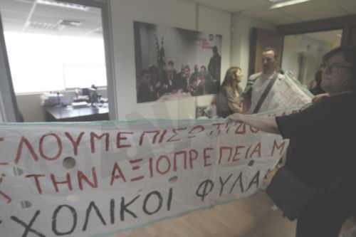 Ένα πανό ανήρτησαν σχολικοί φύλακες και καθηγητές των ΕΠΑΛ, έξω από το υπουργείο Παιδείας, μετά από κατάληψη στο γραφείο του υπουργού Ανδρέα Λοβέρδου.