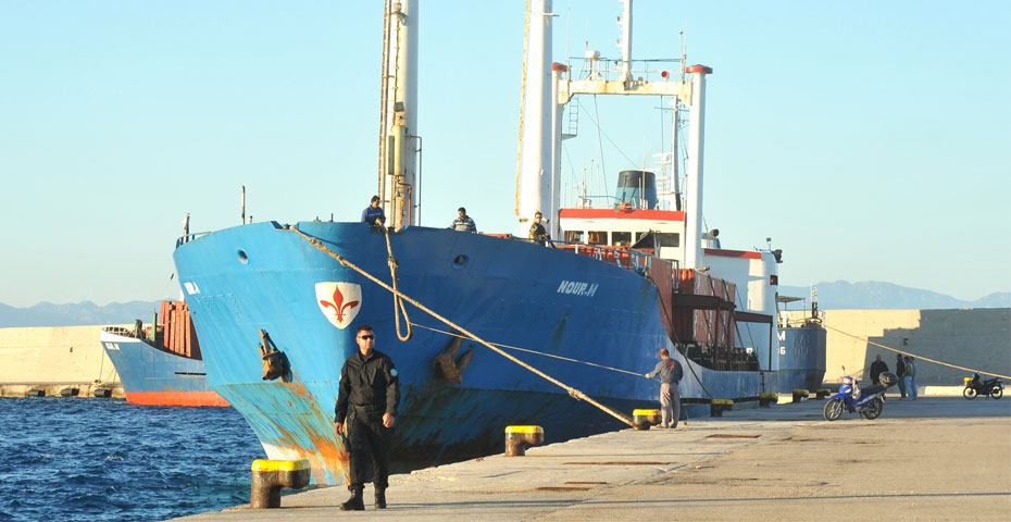 Πάνοπλοι άνδρες του λιμενικού σώματος φρουρούν το πλοίο «φάντασμα», ΝΟUR-M, το οποίο χθες εντοπίστηκε στη θαλάσσια περιοχή των Ιμίων, τέθηκε υπό παρακολούθηση καθώς το δρομολόγιο του ήταν ασύνηθες και το πλήρωμά του υποχρεώθηκε να ακολουθήσει το πλωτό του λιμενικού στο λιμάνι της Ρόδου.